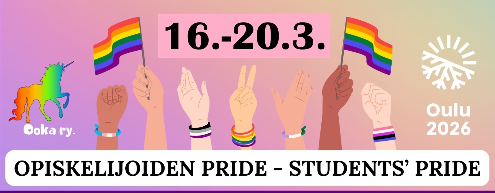 Opiskelijoiden Pride järjestetään osana Oulun yliopiston yhdenvertaisuusviikkoa ja Oulu2026-ohjelmistoa. Tapahtumaviikolla 16.-20.3. järjestetään monipuolisesti erilaista ohjelmaa keskustelutilaisuuksista ja työpajoista hengailuihin, vertaistukiryhmiin ja leffa-iltoihin. Ooka ry yhteistyökumppaneineen tuo ohjelmaa Oulun yliopiston ja Oamkin kampuksille, sekä eri puolille Oulun keskustaa.